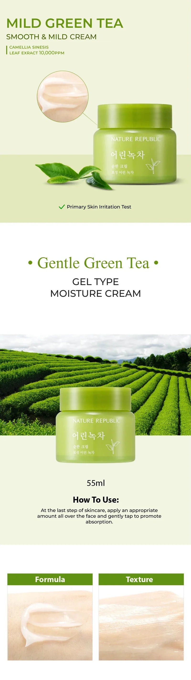 کرم ژلی ضدجوش چای سبز نیچرریپابلیک بسیار سبک حاوی ۱۰۰۰۰ ppm عصاره چای سبز برای مرطوب کردن پوست طراحی شده اند